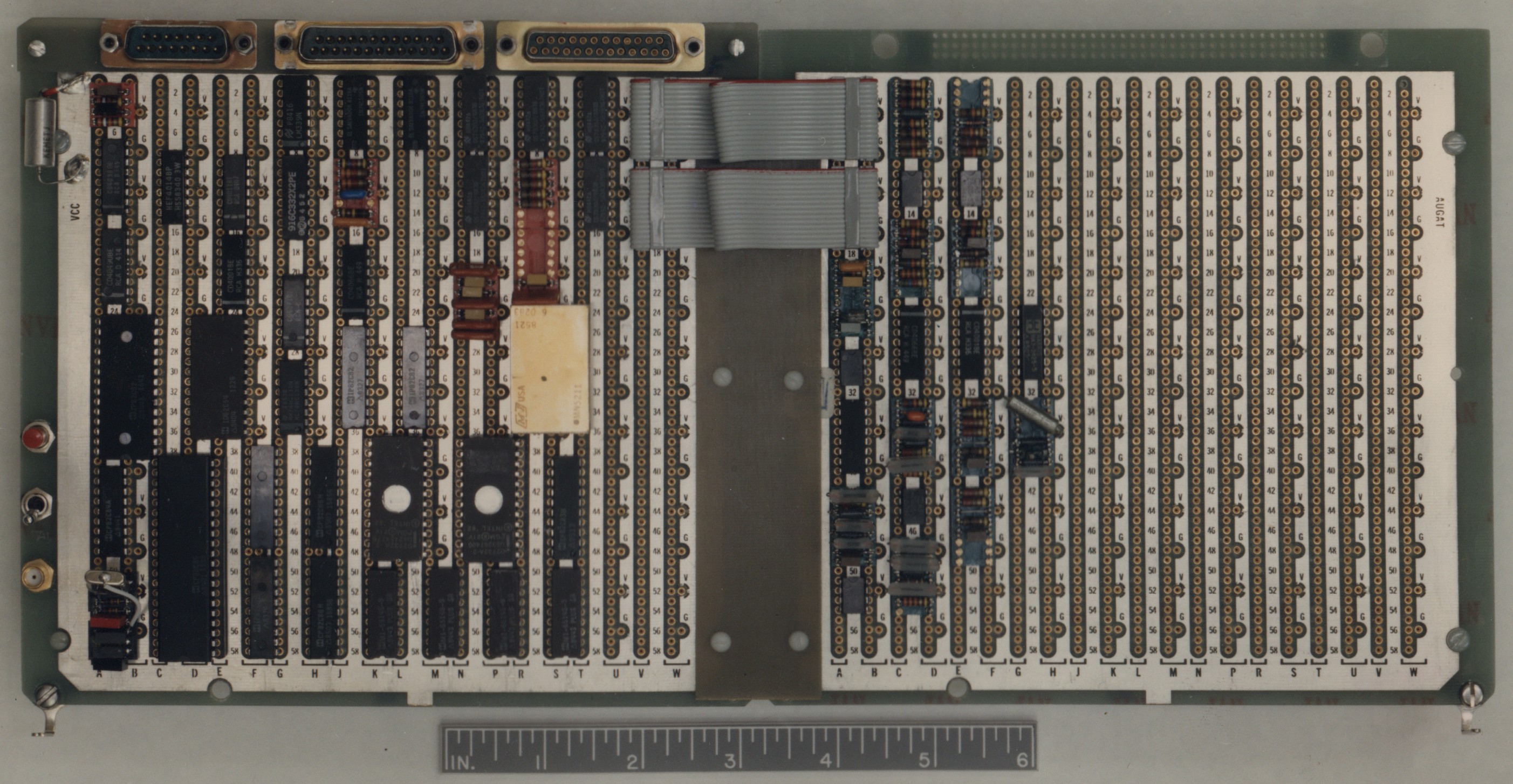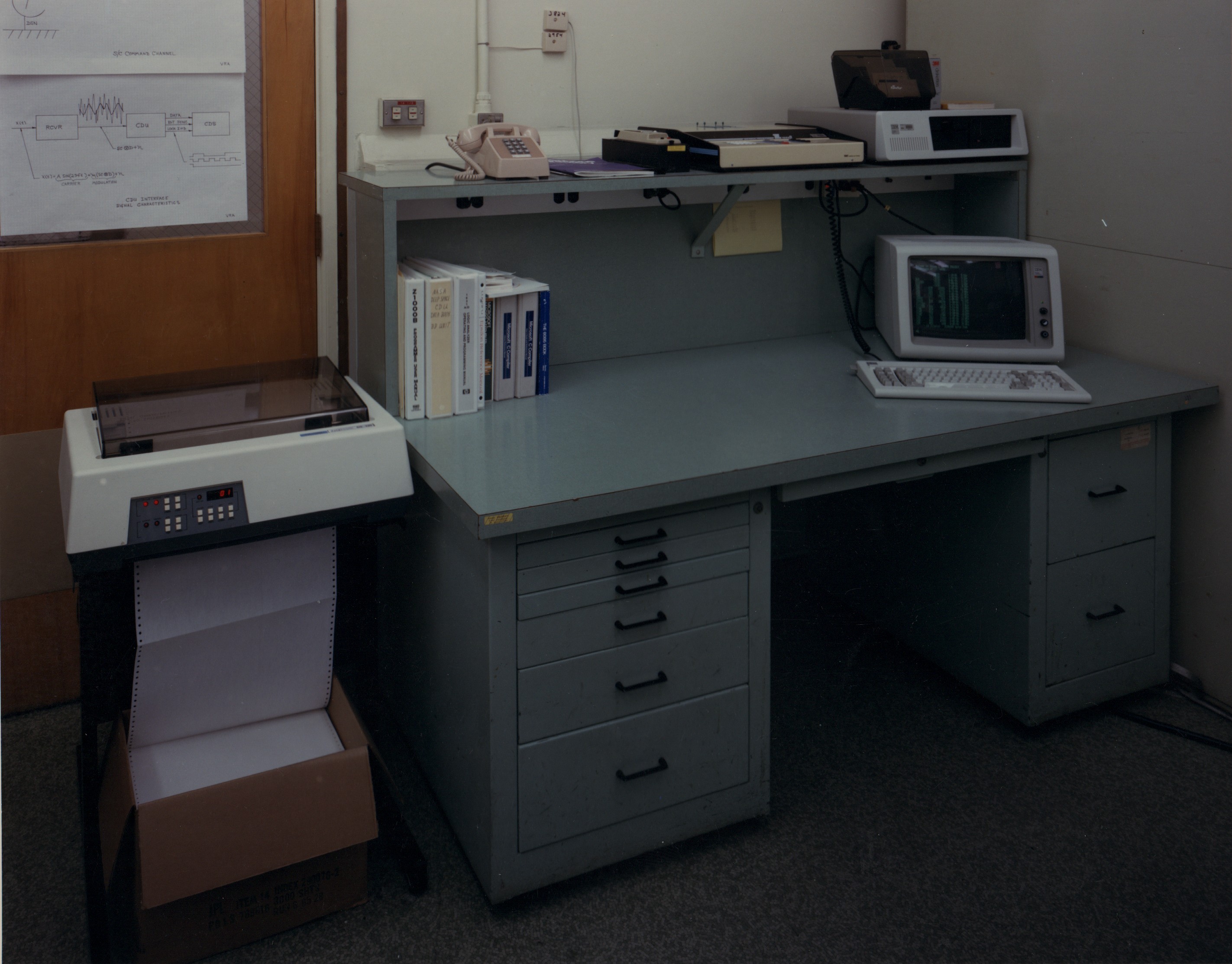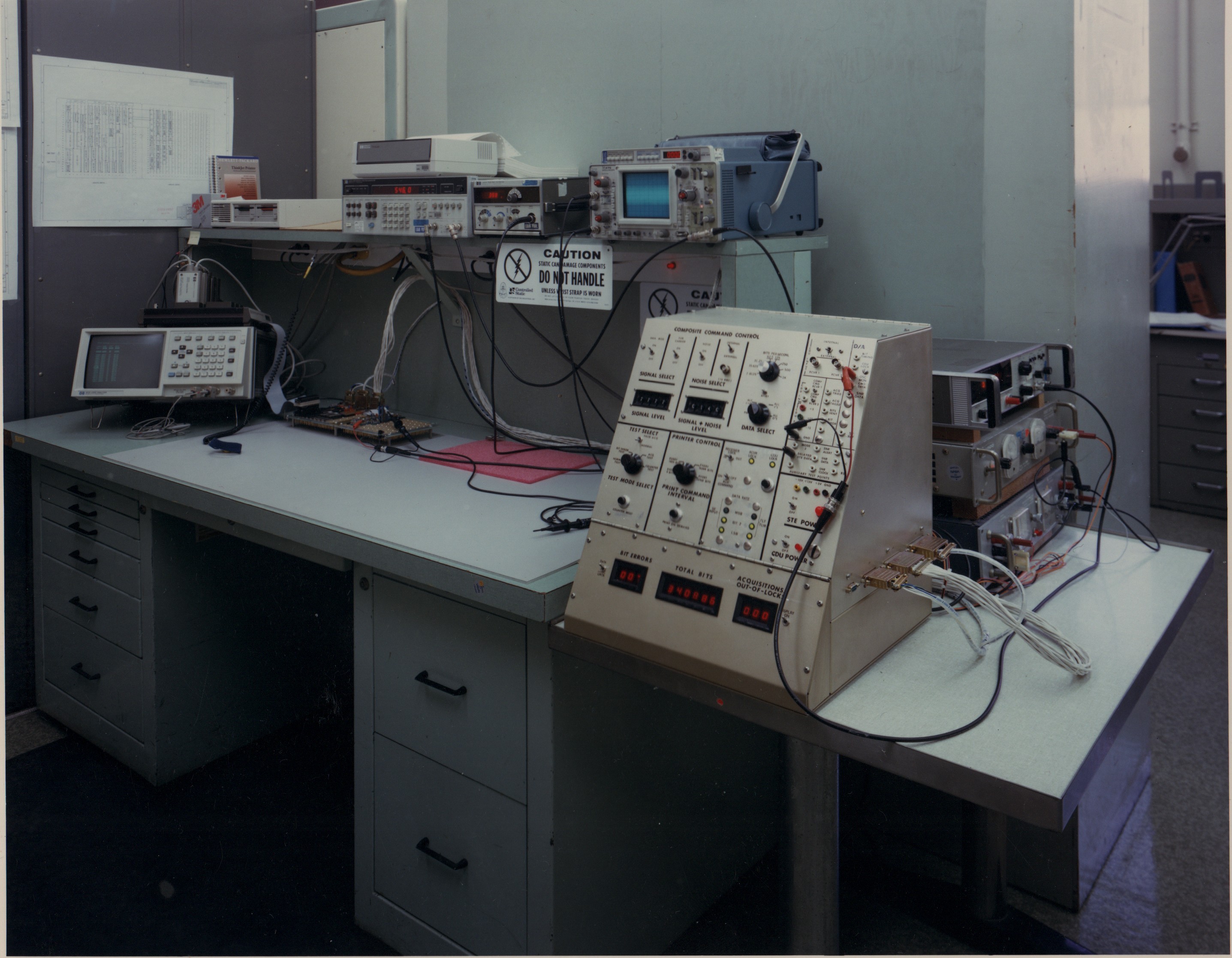 We built a prototype by hand using wire wrap. My desk and our workbench showing the HP logic analyzer and the custom test rig.